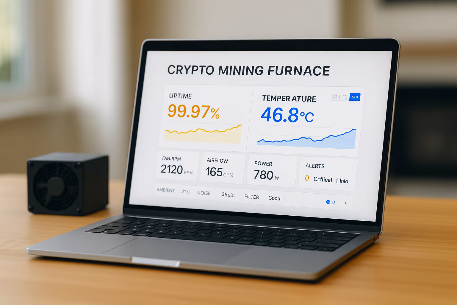 The Crypto Mining Furnace is a next-gen heating system that turns crypto mining heat into sustainable warmth. It runs 24/7, providing autonomous heating while mining cryptocurrency to eliminate your gas, electricity, and internet bills for five years.